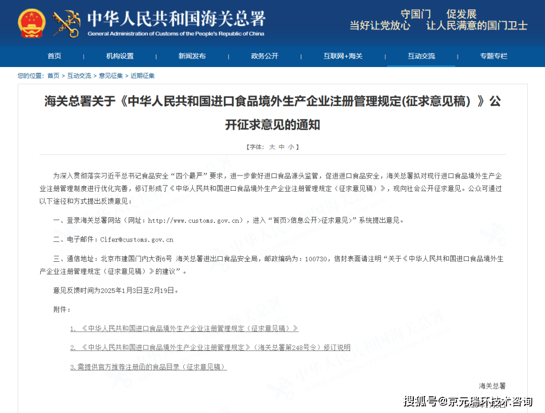 2025年1月3日,中国海关总署发布关于《中华人平易近国进口食物境外出产企业注册办理(收罗看法稿)》公开收罗看法的通知,社会能够正在2025年2月19日前反馈相关看法。